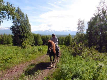 No such luck. I came in for lunch around 2 p.m., and Pete, looking out the window, said, “It’s really coming down.” I cursed inwardly because I was all set to get out and ride. Right now, the wild roses and the wild geraniums are in full bloom. And all the vegetation is green, really green. Vibrant green. It’s also buggy – Tinni was so bothered by them that he bolted a few times. It was not the Tinsi shuffle; rather, it was several all-out bolts. I, of course, put bug dope on Hrimmi before setting out. This enabled her to focus exclusively be on grabbing at vegetation. Grr, grr, grr.