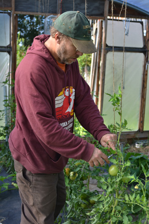 Pete tying up tomato plants