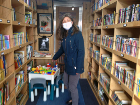 The bookmobile had all the bells and whistles – murals painted on the signs, places for the names of donors under the murals, LED lighting in the book area, switches for turning on lights up front, solar panels that provided energy for light, and books, lots of books, on shelves with bungi type cords holding them in place.