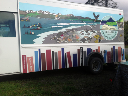 Cheryl took me on a tour – the Friends of the Homer library has constructed a story walk – they take a story each month and put the pages up on stands that are on posts and cover them with plexiglass. The Story Walk was adjacent to the Friends of the Library bookmobile.