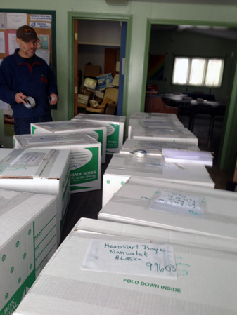 By the time were done, books were ready to go to the Nanwalek Teen Center, Recovery House, Clinic, and Head Start Program. We next loaded them into our truck, with a few additional boxes. Our limit was 10 boxes, 30 pounds each, so we determined that we’d send the three additional boxes media rate.
