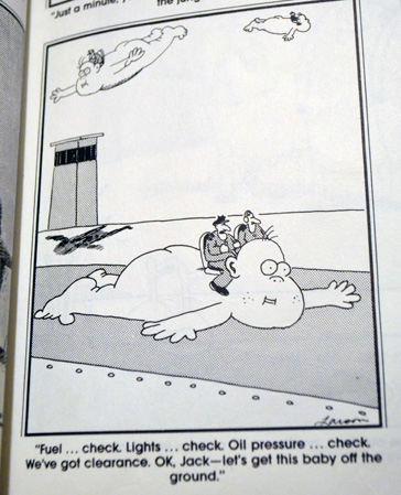 The cartoon accompanying this dispatch is by Gary Larson. It’s of plane pilots attempting to get a baby off the ground. This is an analogy since the pilots would normally speak this way about a plane.