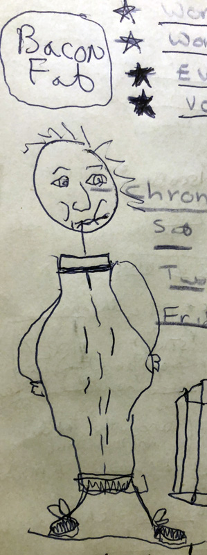 And I felt if not joy, satisfaction during the Bright Lights Book Project board meeting, when I made some inroads in terms of my Bacon Family project. I am going to call my book The Bacon Family Family Scrapbook – it is going to contain individual snapshots if you will, of the Bacon Family at their best. I got this idea as I drew an illustration entitled Bacon Fat, which is of a fat bacon family member.