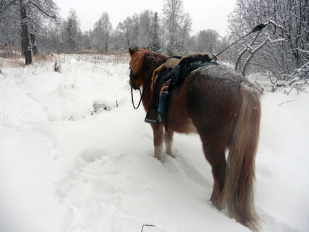 I next got Hrimfara out. I took her up Jim’s Road and out on the snowmobile trails. She moved right along, and like Tinni, she was very agreeable. We walked to the creek before Grizzly Camp, then turned around and headed home, me deciding to take Pete’s Cross-Country trail rather than head home on Siggi’s trail, which is extremely rutted, this because I’ve walked on it so often with the horses.