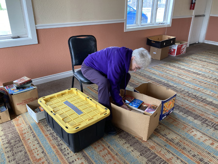 Onward, to the Historic Eagle Hotel where I moved books around, witlessly. I then came up with a plan, which is to take the kids’ books to the Meeting House and to then clean them there. Pam, a volunteer gave me a much-needed assist. In talking with her, I began feeling less overwhelmed. This is a detail that I should remember.