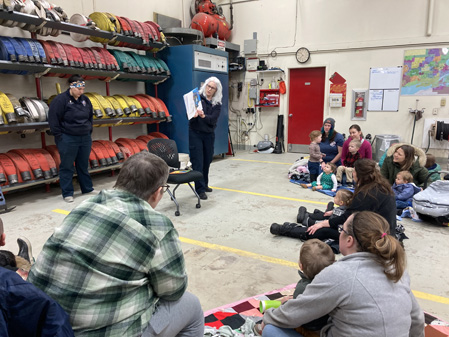 The children didn’t pay much attention – they were eager to keep moving around. They became more interested when Sparky the mascot came out of a side room. Sparky is a fire dog, human sized. Now in having the children’s attention, Cindy began playing her ukelele and singing a fire song. The volunteers then went through the motions of driving a truck, using a hose, and mimicking a fire siren, by waving their hands and going whooo whooo whoo.