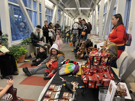 It’s a short drive from the pool to the former banquet room of the Eagle Hotel, so I got there a few minutes after Pam and the developmentally disabled individuals. I spent the next few hours getting ready for this evenings Hall-o-Ween event, which was at Mat-Su College, where Pete teaches. I packed up ten or so banker boxes with books, and Pete both transported them and laid them out on tables. So I had less to do when I got there.