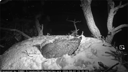 But on the other hand, my occasionally checking in on the nest has alerted me to the fact that raising an eagle’s raising young is no easy matter. The mates have to cooperate with one another. And the eagles have to deal with very harsh conditions. The last two evenings that I’ve looked, one of the eagles, and I do not know if it is male or a female, has remained in the snow-covered nest, head tucked under a wing.