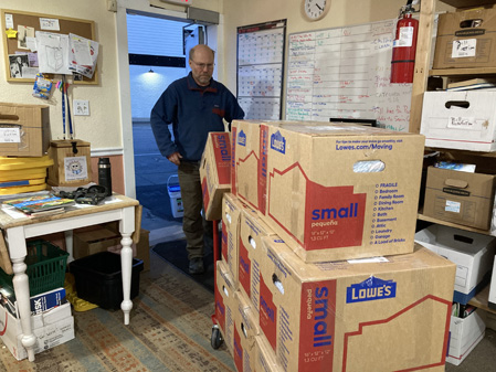 I spent the morning getting the former banquet room of the historic Eagle Hotel in order. I sorted yesterday’s books and boxed up the books that I’ll be taking to the Anchorage conference. I was joined by Susan, who attempted to help me in making sense of last night’s meeting.