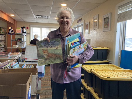 I put all this on the back burner when the third graders finally arrived. There were, with parents, at least 20 people in the former banquet room of the historic Eagle Hotel. We began with them book cleaning. I did not go into great detail as to what to do because I feared that being young, the youngers would not listen. So I let them have at it. They did ask questions as things came up, and I think they did an amazingly good job. They, along with their parents, self-organized. They cleaned, sorted, and even categorized books. And we all got to know one another.