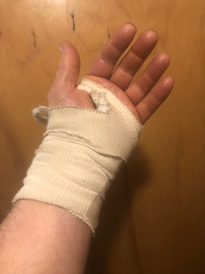 He got a ride from Pam back to the former banquet room of the historic Eagle Hotel. He walked into the room – his hand had a large white bandage. He later told me about the surgery – it sounded ghastly. He was loaded up with lidocaine, and a curtain was put up, so he could not see the procedure. He said he could hear what was going on. It was, in my estimation, worse than cataract surgery.