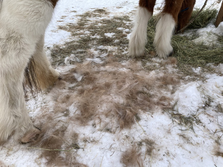 It's harder to brush horses that are wet. The hair doesn’t come out as easily. But I did it anyways, starting with Hrimmi, who is now blowing her coat. Big globs of white/red-brown hair came out. I was using the extra-large FURminator. And kept coming out. I didn’t even begin to get it all. Some fell to the ground and the rest I put in a muck bucket.