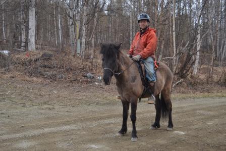 And so, after breakfast, we headed in the direction of the horse shelter. We tied Siggi, Tinni, and Raudi in their respective places. As Pete opened the gate separating the large and small paddock, so that Hrimmi and Signy could have access to the paddock, I first got the tack out, and then ran and grabbed my camera. Pete saddled and bridled both horses, and after we took Siggi down to the road. There, I took his and Pete’s photo, this before next fetching Raudi. We rode around the loop, leaving Tinni to eat and foal watch.
