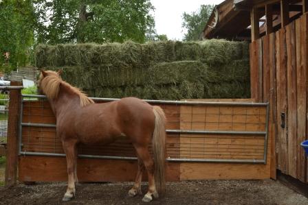 We then did what over the past eight years has become routine. I hopped up onto the trailer and handed Pete bales, and he stacked them in the shed. The older horses were enthusiastic onlookers – they know the full trailer means that they’ll soon have access to fresh hay. Younger Hrimmi got all excited. Of course, she had no idea what was up. All she knew was that something good was up.