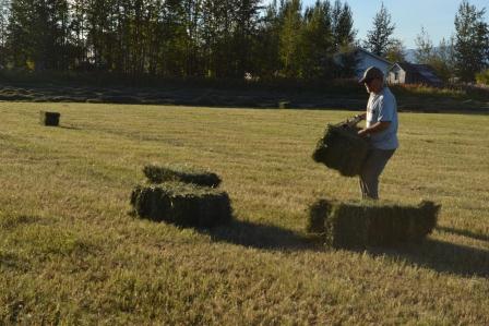 The awaited call came at 5:04 p.m. Farmer says he’s baling. Pete hitched the trailer to our ’75 Dodge pickup, and I put animals away. (Dogs and horses were hanging out on the lawn.) We grabbed gloves, and were off.